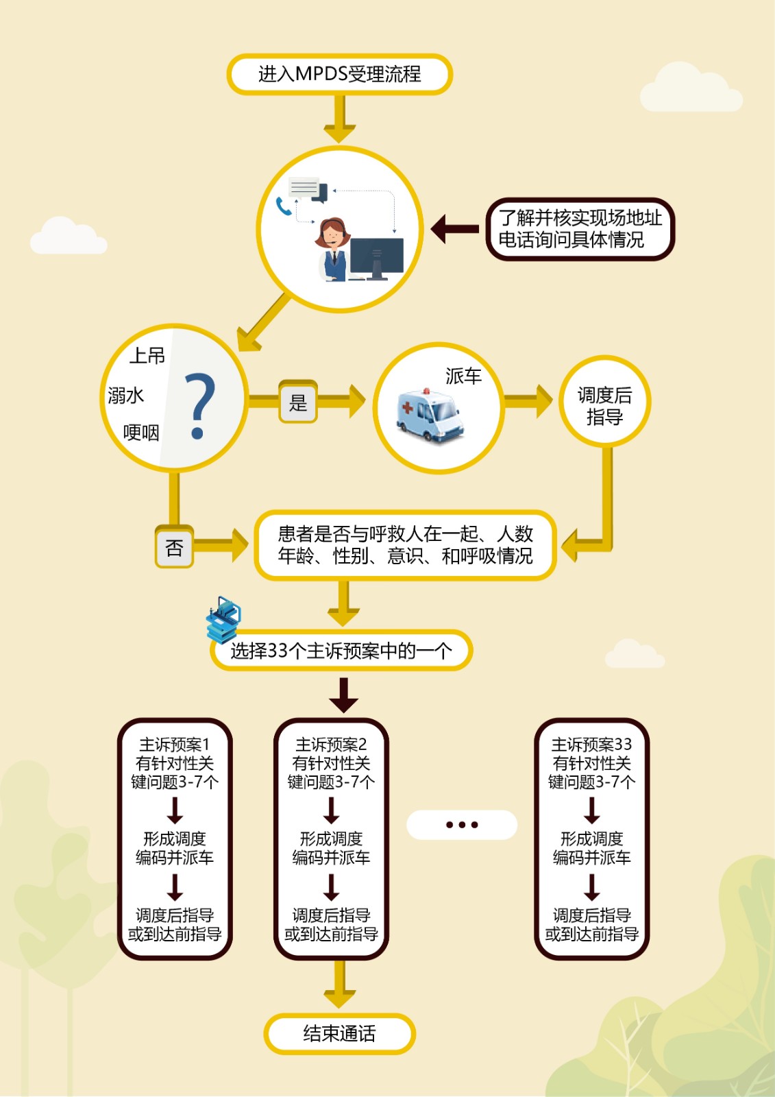 MPDS涵盖了心跳或呼吸骤停、哽咽、分娩、高处坠落、触电等30余种疾病预案,在救护车和急救人员到达现场前,120调度员通过MPDS可以为呼救者提供清晰的、易于遵从的指令,从而精准地指导他及时地采取措施进行自救或互救,有效填补了急救人员赶赴现场的空窗期,为患者争取了更多宝贵的院前急救黄金时间。开展自救、互救提供精准指导,争取更多宝贵的黄金救援时间。
